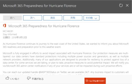 日本にいるとなかなか情報として入ってこないと思いますが、アメリカではハリケーンが猛威を振るっていて、マイクロソフトのデータセンターもその渦中に入っていたようで、メッセージセンターにハリケーンへの備えが記載されていました。 内容は備えがきちん…