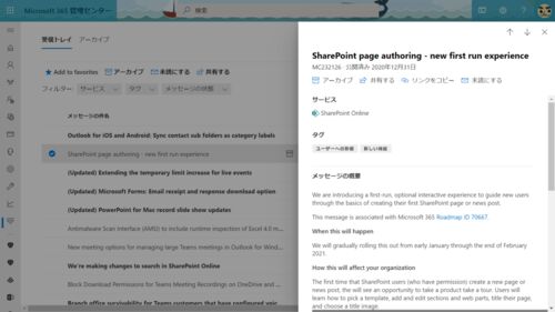 2020 年もあとわずか。そんな状況でも Microsoft 365 の中の人は新機能をお知らせし続けてくれるようです。というわけで、メッセージセンターを眺めていたところ、 SharePoint ページの新しい機能がアナウンスされていました。 2021 年 1 月初旬から 2 月末…