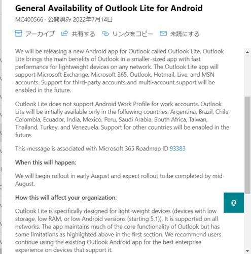Microsoft 365 メッセージセンターを眺めていたところ、 Outlook の新しいバージョンの話題が提供されていました。 その名も Outlook Lite for Android です。 記載されたメッセージを見ると、 南米や APAC を中心にリリースを行い、その後サポート範囲を広…