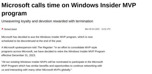 まだ公式なアナウンスは見当たらなかったのですが、 Windows Insider MVP が Microsoft MVP に統合されるという話が上がっていました。 https://www.theregister.com/2023/10/30/windows_insider_mvp_ends Windows Insider MVP とはフィードバックハブを通じ…