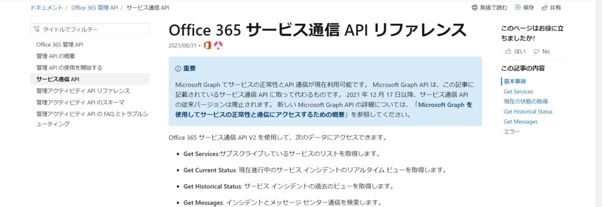 Microsoft 365 の API はここのところ Microsoft Graph へどんどん入れ替わっていますが、サービスの正常性を確認するための API もその対象の一つとなっています。