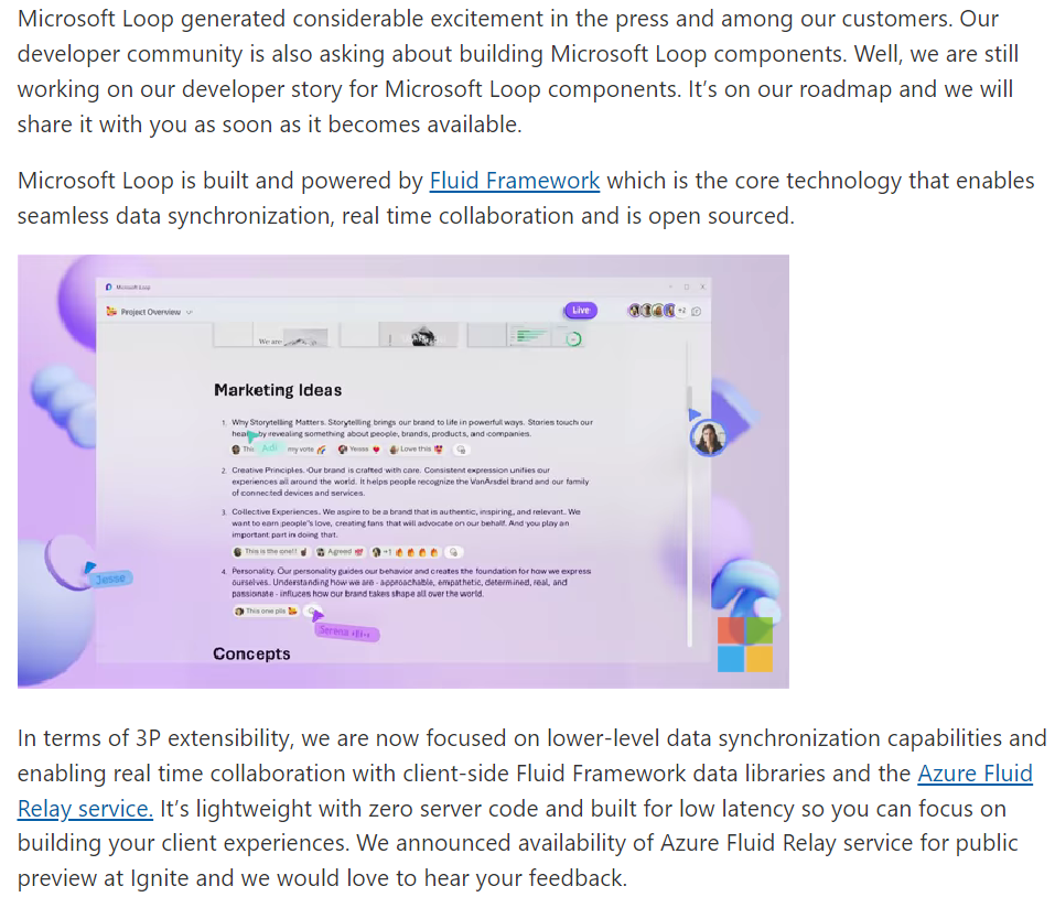 Ignite 2021 で正式にリリース予定がアナウンスされた Microsoft Loop ですが、この機能のもととなっている Fluid Framework を活用した PaaS が Dev Blog で案内されていました。