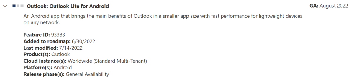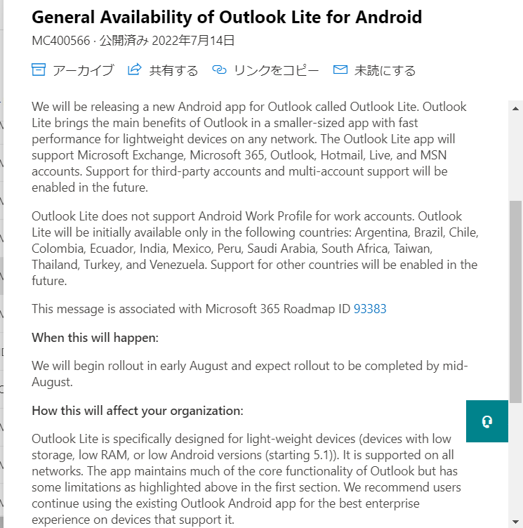 Outlook Lite については 2022 年 6 月末にロードマップに追加されていたようです。