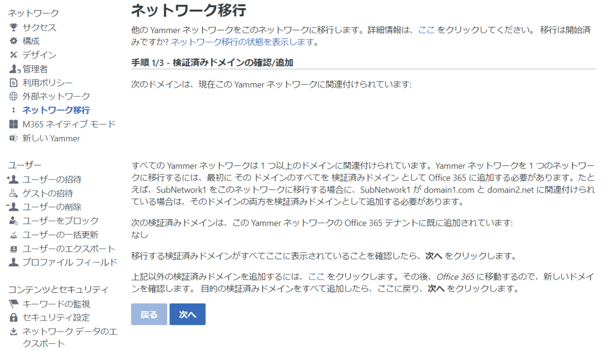 ドメインをネイティブネットワークに登録しておく、、、という手順となるのですが、これがかなり厄介で、昔から Yammer をゲストとして利用しているユーザーがいるとネイティブ化できない仕様があり、各ユーザーにお伺いを立てていかないと移行できなかったのです。