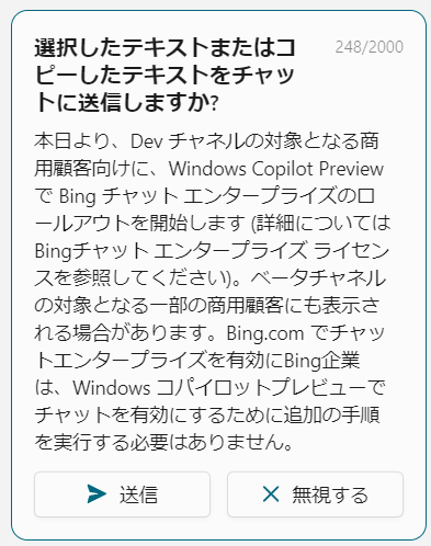 ただ、 Windows Copilot には更新が入っており、 Bing Chat Enterprise と連携し多とのこと。以下は Windows Copilot を起動させたときに表示された内容です。