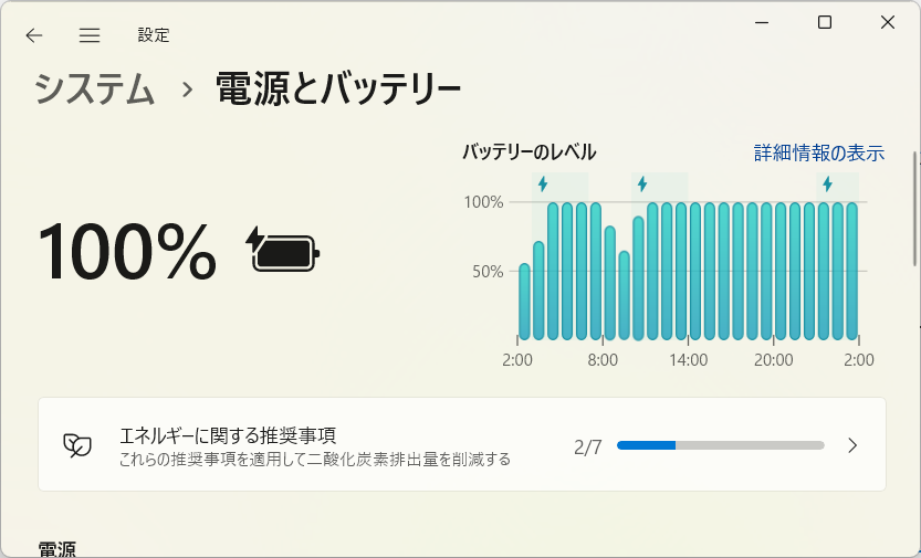 さらにちょっと気になったのが以下の設定アプリ - システム - 電源とバッテリー にあるグラフが表示されなくなっているみたいです。視覚的にどんな充電状況だったのかが分かった機能ですが、下部にある詳細を開かないと見えなくなるようです。ちょっと残念。