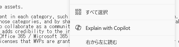 Copilot に入れたい言葉を選択して右クリック、 Explain with Copilot をクリックすれば使えるのですが、気を付けるべきは 2,000 文字までしか使えない機能ということです。