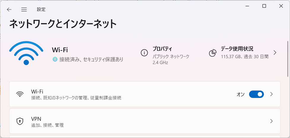 というわけで、設定アプリのネットワークとインターネットを開き、一番上のプロパティをクリックします。