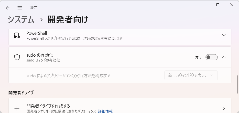 設定 - システム - 開発者向け 内に「 sudo の有効化」が追加されています。これをオンにすると sudo が利用できるようになります。 runas は使いづらかったのでこれはよいですね。