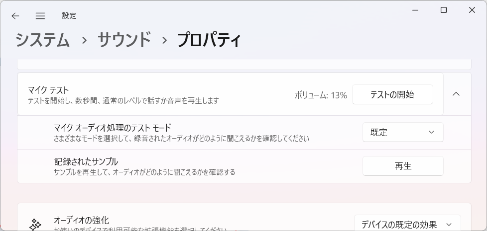 続いてボリュームチェックです。設定 - システム - サウンド - プロパティ にマイク テストが追加されました。