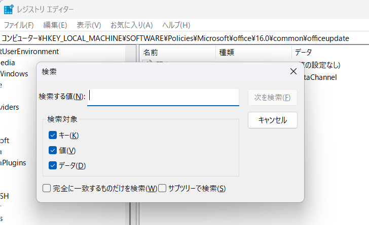 レジストリ エディターでは検索機能にサブツリー検索ができるようになっています。