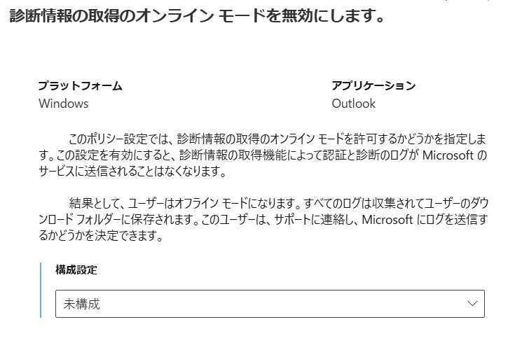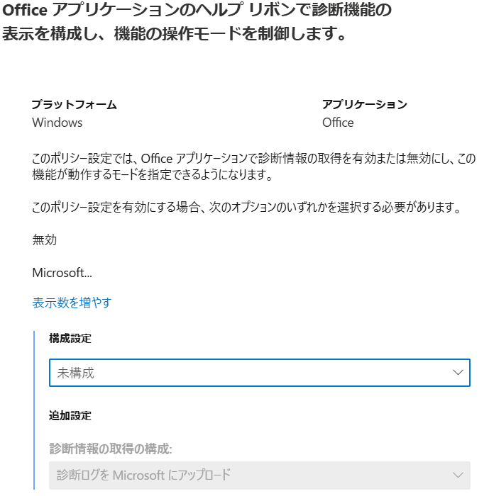 ポリシーをつくったら設定の構成にある検索ボックスに「診断」と入力して「 Office亜アプリケーションのヘルプ リボン~」という項目と「診断情報の取得のオンラインモードを無効にします。」の 2 つを構成したうえで、それぞれを設定していってください。