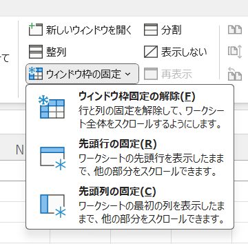 ウィンドウ枠の固定は表示リボンのウィンドウグループに入っています。