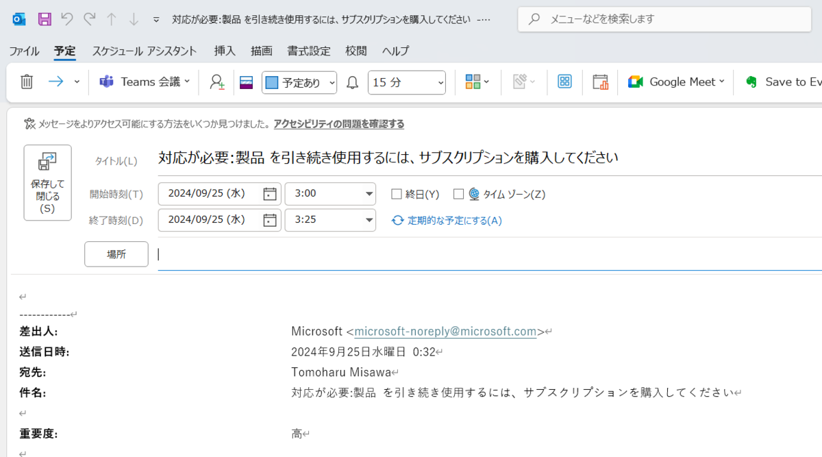 これ、あくまで予定なので自身のカレンダーに追加される状態ですが、必要に応じてスケジュールアシスタントを開くことで会議に昇格させることも容易です。