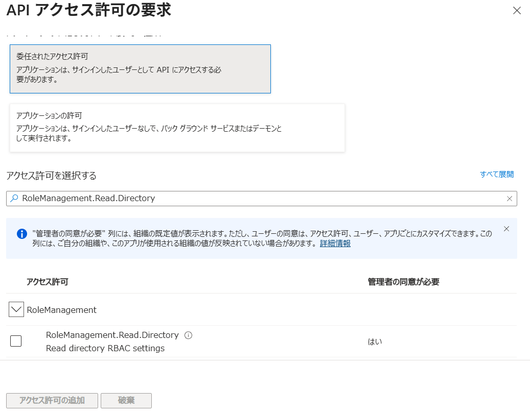 委任されたアクセス許可またはアプリケーションの許可を選択し、検索ボックスに上記の値を入力すれば設定できます。